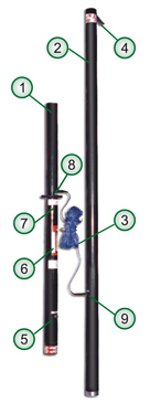 Если высота расположения проводов над землей превышает 3,5 м, то используются электроизолирующие штанги ШЭУ®. Нужное количество звеньев ШЭУ® вставляют между измерителем и датчиком тока. При эксплуатации ИТВЛ-0,4 совместно со штангой ШЭУ® в целях безопасности излишки соединительного провода наматывают на ШЭУ®.