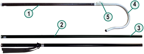 В состав анкерной штанги входят звено 1 с крюком-захватом, звено 2 (штанга дополнительная ДЗ) и звено 3 (штанга-насадка на 35 кВ с ограничительным кольцом, отделяющим рукоятку от изолирующей части).