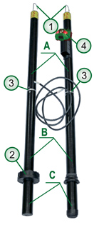 В корпусах из стеклопластика расположены рабочие (А), изолирующие части (В) и рукоятки (С) (см. рис. 1). Соединения высоковольтного провода и рабочих частей выполнены неразъемными. Внутри рабочих частей размещены высоковольтные диоды и балластные резисторы. Длина высоковольтного провода, соединяющего рабочие части, не менее 1500 мм.