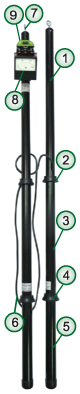 Устройство УПП-10-УНТЕХ (рис. 1) состоит из двух полых штанг из стеклотекстолита. Внутри них размещены элементы электрической схемы. Рабочая часть устройства 1 (участок от контактного вывода до ввода высоковольтного провода) отделена разделительным кольцом2 от изолирующей части 3 (участок от высоковольтного провода до упорного кольца 4 рукоятки 5). Штанги соединены гибким проводом 6 в высоковольтной изоляции, сохраняющей гибкость при температуре до –70 ˚С. На концах штанг предусмотрены контактные выводы 7 для касания шин в электроустановках. К одной из штанг прикреплен стрелочный индикатор 8.