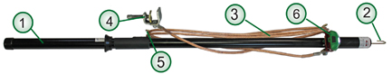 УРК-15-УНТЕХ содержит электроизолирующую штангу 1, насадку с дополнительным сопротивлением 5кОм и контактом-наконечником 2, медный заземляющий провод в прозрачной оболочке3, струбцины4 и приспособления для намотки провода5, курсовой фонарь VONATEX™6, обеспечивающий повышение безопасности и производительности работы в условиях недостаточной освещенности.